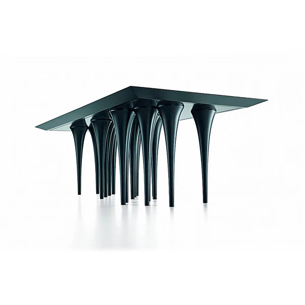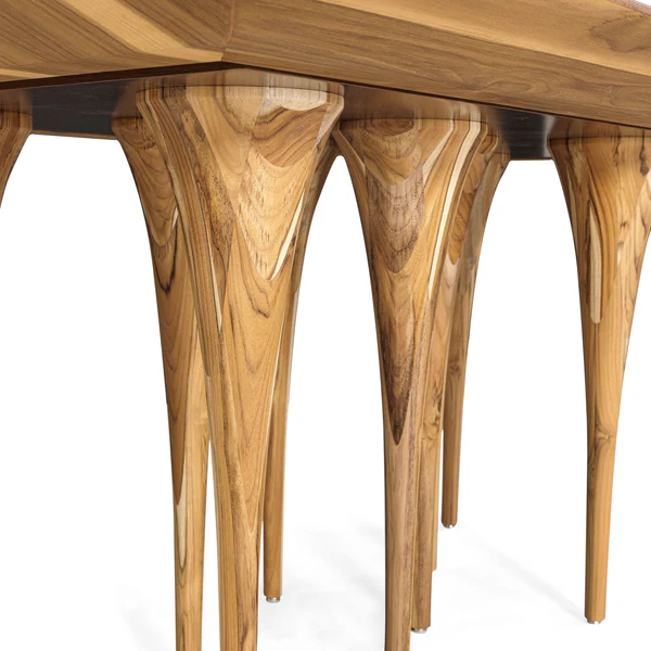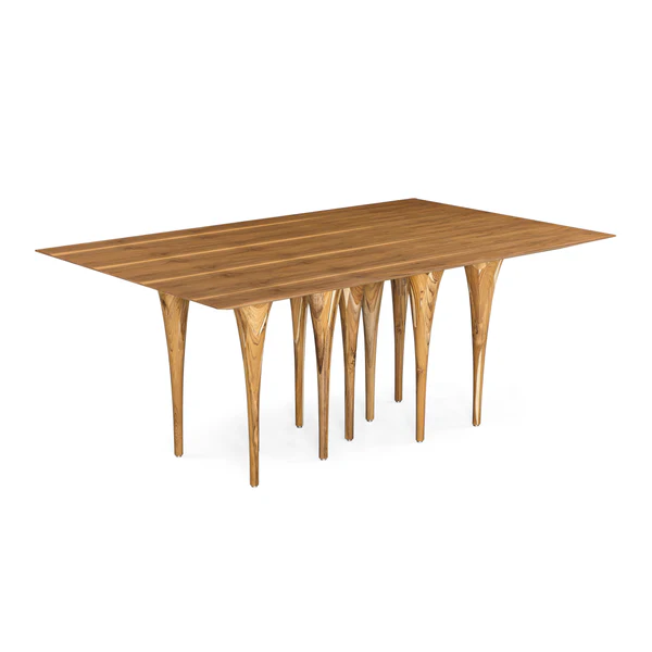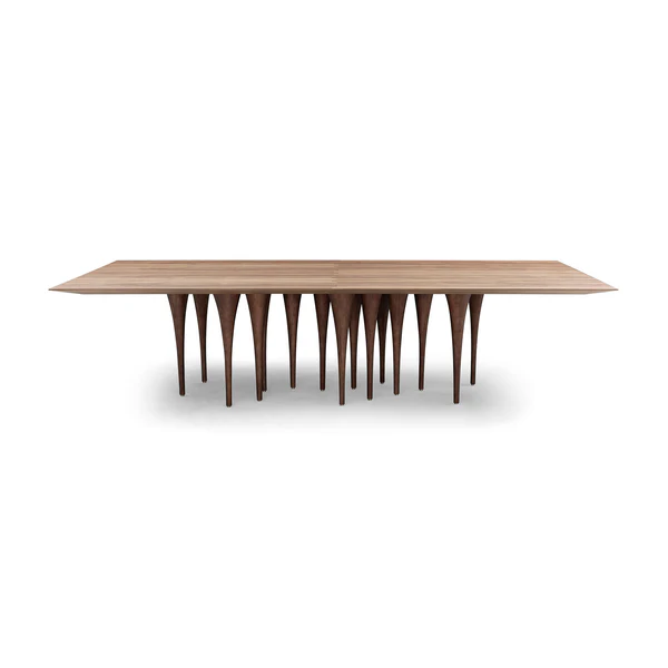 Evocative of Gothic architecture, the Pin dining table commands attention with its sculptural base—columns that flare outward in a dramatic gesture. Handcrafted in solid wood and topped with a rich veneer, its architectural silhouette brings a sense of grandeur to the dining space. Designed for versatility, Pin offers flexible configurations while maintaining an unmistakable elegance rooted in craftsmanship and form.