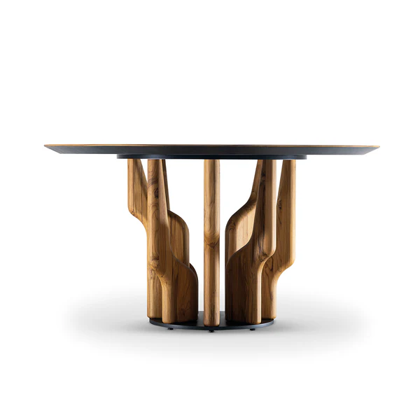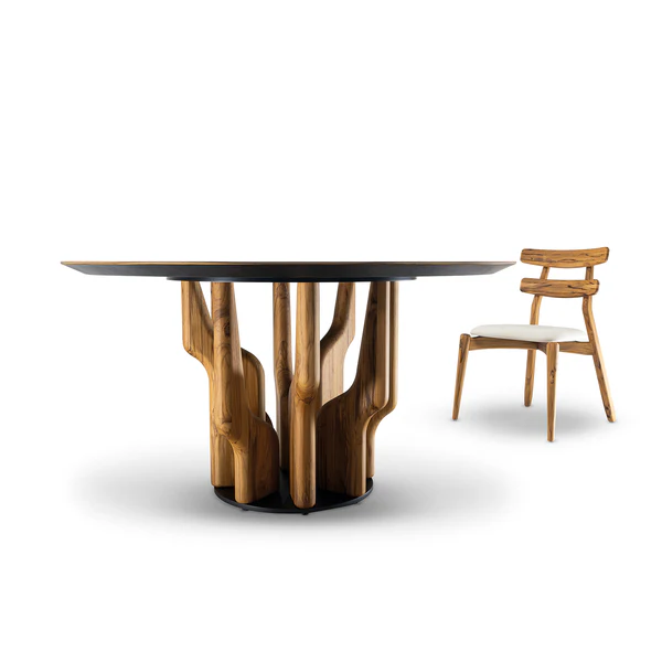 With its sculptural base carved from solid wood, the Raizes Round Dining Table echoes the graceful strength of branching roots. The round top, finished in natural wood veneer and subtly beveled at the edges, offers a refined counterpoint to the organic form below. This piece captures the balance between natural inspiration and thoughtful craftsmanship—designed to bring elegance, warmth, and a sense of connection to any dining space.